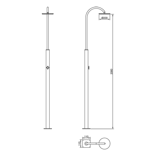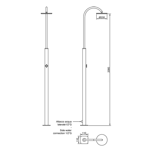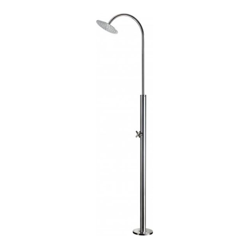 Shower column for outdoor stainless steel AISI 316L, GIO collection. Classic design, totally MADE IN ITALY. Composed shower head in stainless steel AISI 304 Ø 200 mm thickness 2 mm and screw stopcock. Water connection 1/2"G. Work with cold water only.