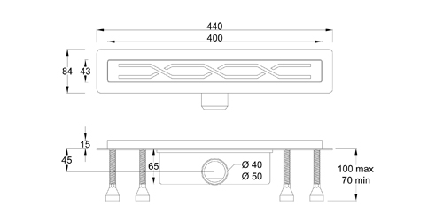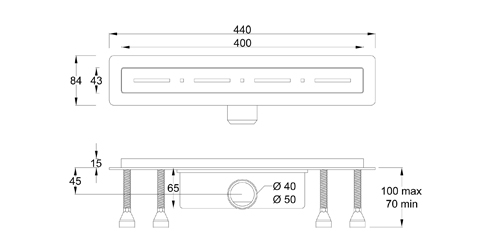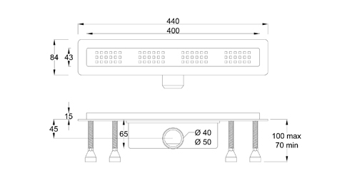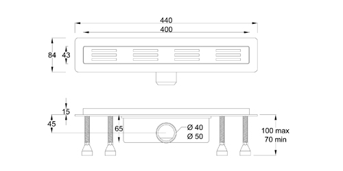 FEATURES: MADE IN ITALY, ABS floor drain grids, grid in stainless steel, lenght 400 mm, total hygiene, not affected by the use of aggressive cleaning products, overall height at floor level 70 or 85 mm, inner slope directing water to the drain, avoiding stagnant smelly, 35 mm water seal, water volume 36 lt/min, removable trap for cleaning and for periodic inspection, adjustable supports to ease the installation, perimetric waterproof sheet that can be directly glued to tiles, 5 years warranty and box single packed.