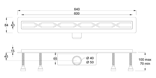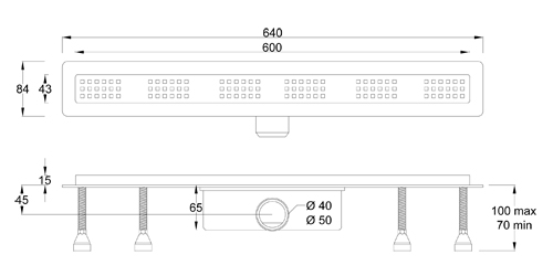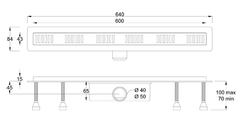 FEATURES: MADE IN ITALY, ABS floor drain grids, grid in stainless steel, length 600 mm, total hygiene, not affected by the use of aggressive cleaning products, overall height at floor level 70 or 85 mm, inner slope directing water to the drain, avoiding stagnant smelly, 35 mm water seal, water volume 36 lt/min, removable trap for cleaning and for periodic inspection, adjustable supports to ease the installation, parametric waterproof sheet that can be directly glued to tiles, 5 years warranty and box single packed.