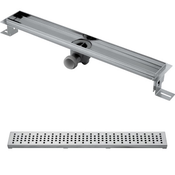 FEATURES: MADE IN ITALY, stainless steel AISI 304 floor drain grids, lenght 90 cm, total hygiene, not affected by the use of aggressive cleaning products, overall height at floor level 85 or 105 mm, inner slope directing water to the drain, avoiding stagnant smelly, modularity assembly sequence covering any measure, galvanic patented treatment, exceptional resistance to acidic and saline environments, tests carried out: 2.000 hours in salt spray, preassembled siphon, with patented locking watertight system, possibility of 360° orientation and complete inspection, exhaust flow 30 lt/min, 5 years warranty and box single packed.