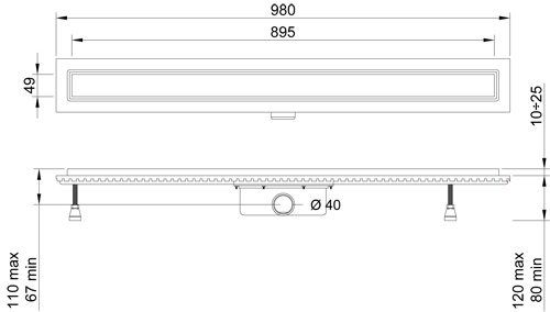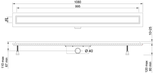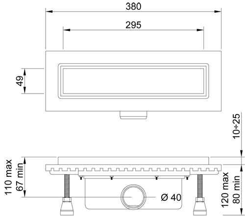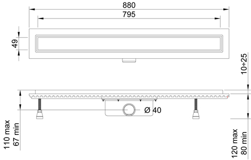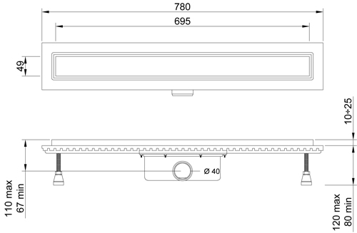 FEATURES: MADE IN ITALY, stainless steel floor drain grids, stainless steel grid, lenght 300 mm, total hygiene, not affected by the use of aggressive cleaning products, overall height at floor level 80 mm, inner slope directing water to the drain, avoiding stagnant smelly, 35 mm water seal, water volume 46 lt/min, removable trap for cleaning and for periodic inspection, adjustable supports to ease the installation, perimetric waterproof sheet that can be directly glued to tiles, 5 years warranty and box single packed.
