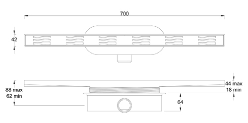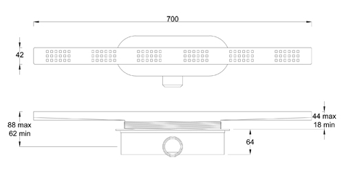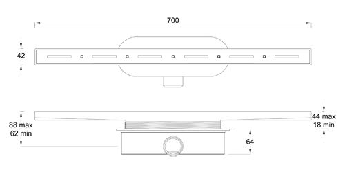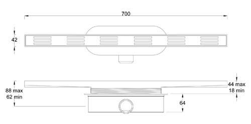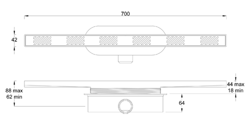 FEATURES: MADE IN ITALY, ABS floor drain grids, grid in stainless steel, lenght 700 mm, total hygiene, not affected by the use of aggressive cleaning products, overall height at floor level 85 mm, inner slope directing water to the drain, avoiding stagnant smelly, 35 mm water seal, water volume 42 lt/min,