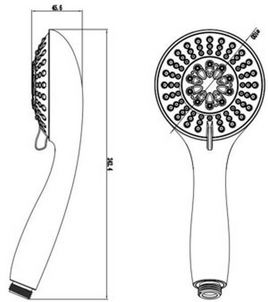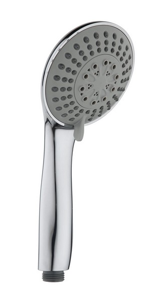 FEATURES: MADE IN EUROPE, 5 limescale water jets hand shower, water jets: rain, rain + soft, soft, soft + massage, massage, round shape Ø 100 mm , ABS chrome plated, gray face plate, gray limescale nozzles easy to clean, 1/2" M connection, designed and developed for low water consumption, water flow reducer of 9,5 lt/min included, high performance with low water pressure, with new innovative air induction system, 5 years warranty, plastic bag single packed.