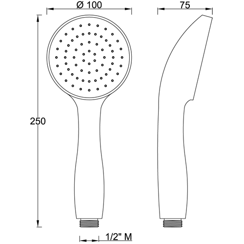 FEATURES: MADE IN EUROPE, 1 limescale water jet hand shower, round shape Ø 100 mm, made of high impacted ABS chrome plated, chrome plated face plate, gray limescale nozzles easy to clean, 1/2" M connection, designed and developed for low water consumption, high performance with low water pressure, with new innovative air induction system, 5 years warranty, plastic bag single packed.