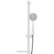 Complete stainless steel matt white sliding rail, round tube, SIMPLY collection. ABS polish white hand shower, FLAT collection, limescale water jet, round shape Ø 100 mm, 1 water jet. Steel chrome plated 150 cm flexible hose, white ABS soap dish.