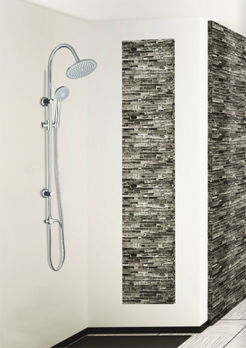 Colonna doccia completa in acciaio inox cromato serie ACQUAMARINA. Compresa di deviatore automatico quadro, centralina scorrevole, soffione tondo snodato in ABS cromato Ø 200 x 10 mm con ugelli anticalcare, tubo colonna doccia Ø 24 mm, doccia tonda Ø100 mm in ABS cromato 3 getti con ugelli anticalcare, supporti a muro regolabili e flessibile in acciaio inox doppia aggraffatura 150 cm.