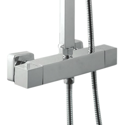 Colonna doccia telescopica completa in ottone cromato serie RUBINO ONE. Compresa di miscelatore termostatico quadro esterno con cartuccia deviatrice e doppia uscita 1/2", centralina scorrevole in ABS cromato, soffione in acciaio inox 200 x 200 mm ultra piatto, doccia in ABS cromato 1 getto con ugelli anticalcare e flessibile in acciaio inox doccia doppia aggraffatura 150 cm.