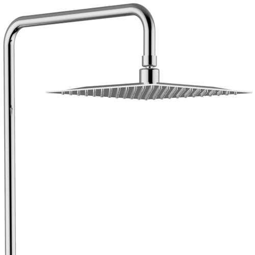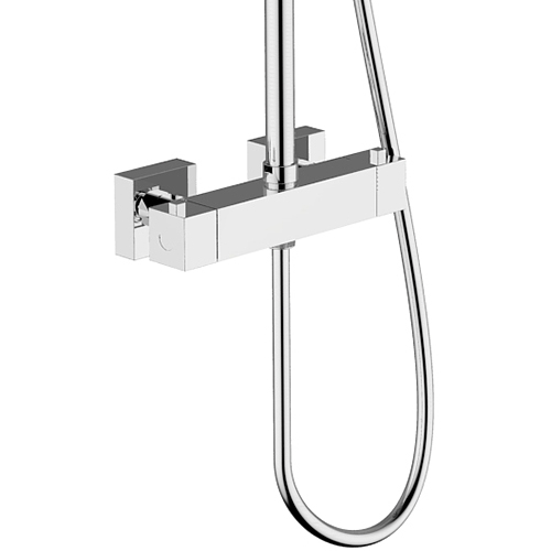 Colonna doccia completa con miscelatore termostatico in ottone cromato serie SMEMO. Completa da soffione quadro 250 x 250 mm in ottone cromato, tubo tondo in ottone cromato Ø 25 mm, regolabile in altezza, doccia in ottone cromata quadra 1 getto anticalcare, flessibile doccia in PVC 150 cm, centralina scorrevole, miscelatore termostatico esterno doccia a 2 vie, maniglie termostatiche quadre 45 mm, vitoni ceramici G1/2", eccentrico con rosone quadro (2 pz).