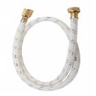 Set doccia per bidet in polipropilene bianco, serie MOON, 1 getto fisso con pulsante oro start and stop, attacco ½” M. Completa di supporto fisso con sede conica. Flessibile retinato lunghezza 120 cm con attacco 1/2" F x 1/2" conico. PROUDLY MADE IN ITALY.