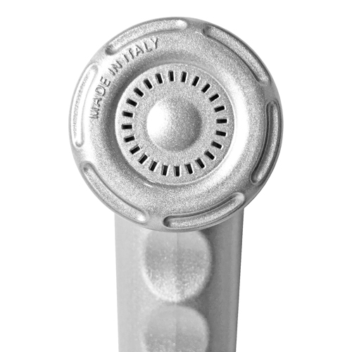 Set doccia per bidet in polipropilene verniciato grigio metallizzato, serie MOON, 1 getto fisso con pulsante cromo start and stop, attacco ½” M. Completa di supporto fisso in abs cromato con sede conica. Flessibile in PVC grigio anti torsione, lunghezza 120 cm con attacco 1/2" F x 1/2" conico. PROUDLY MADE IN ITALY.