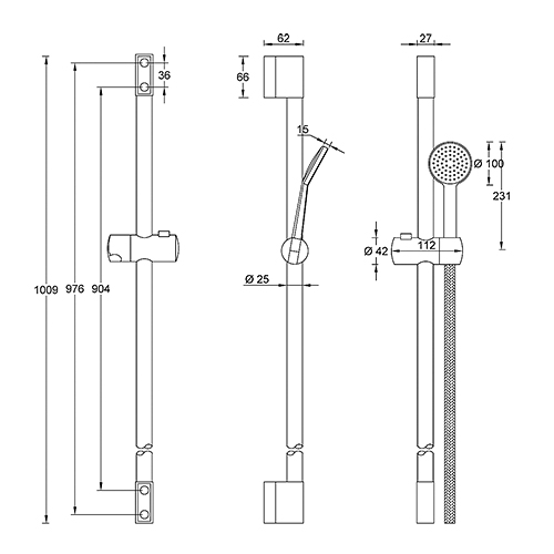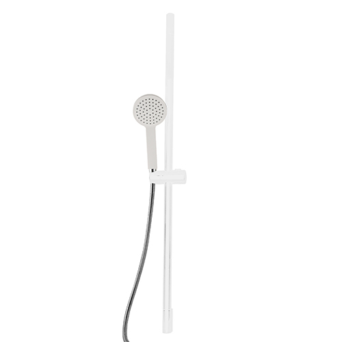 Saliscendi completo con tubo tondo Ø 25 mm in acciaio inox bianco opaco serie CLASSIC, con doccia in ABS bianco lucido 1 getto anticalcare serie FLAT e flessibile doccia doppia aggraffatura in acciaio inox cromato da 150 cm.