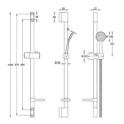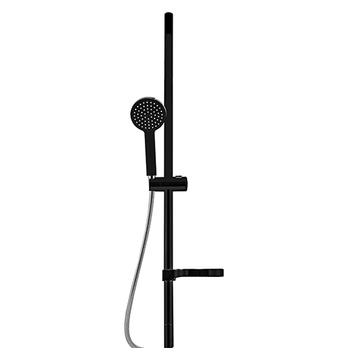 Saliscendi completo con tubo tondo in acciaio inox bianco opaco serie CLASSIC, con doccia in ABS bianco lucido 1 getto anticalcare serie FLAT e flessibile doccia doppia aggraffatura in acciaio inox cromato da 150 cm, porta sapone sapone in ABS bianco.