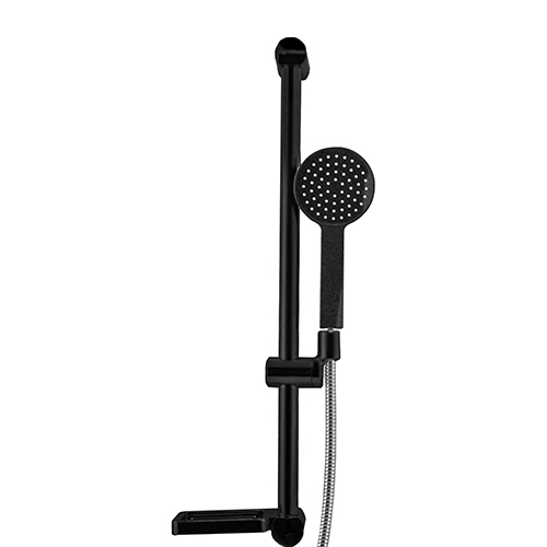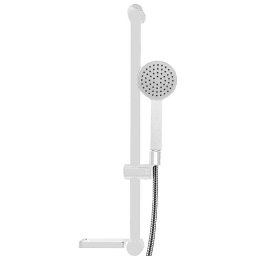 Saliscendi completo con tubo tondo in acciaio inox bianco opaco serie SIMPLY, con doccia in ABS bianco lucido 1 getto anticalcare serie FLAT e flessibile doccia doppia aggraffatura in acciaio inox cromato da 150 cm, porta sapone in ABS bianco.