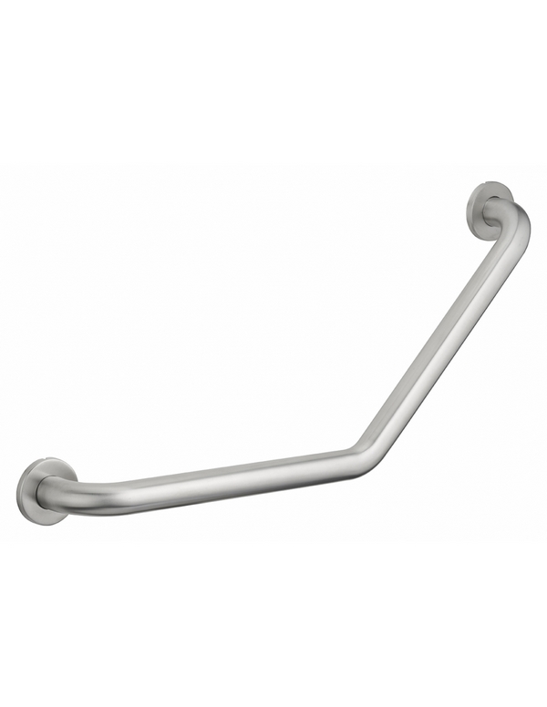 Maniglione di sicurezza angolare a 45° in acciaio inox della serie SALLY. Installazione a parete, tubo diametro 32 mm. Completo di borchie coprivite in acciaio inox e di piastre di fissaggio in nylon. Materiale per il fissaggio incluso nella confezione. Prodotto interamente in ITALIA.