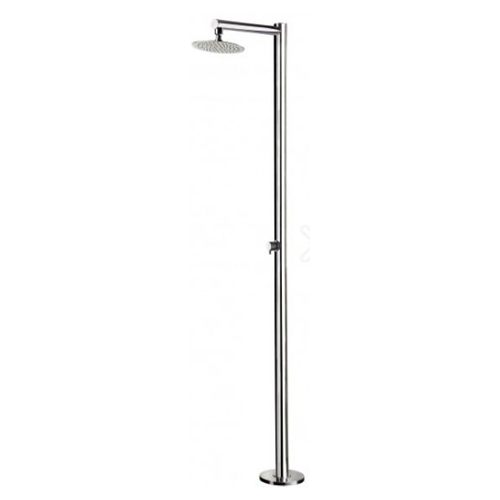 Colonna doccia per esterno in acciaio inox AISI 316L, serie ASTRO. Dal design moderno, totalmente MADE IN ITALY. Composto da soffione in acciaio inox Ø 200 mm, spessore 2 mm e miscelatore. Collegamento acqua a pavimento da 1/2”G. Predisposta per il funzionamento acqua calda/fredda.