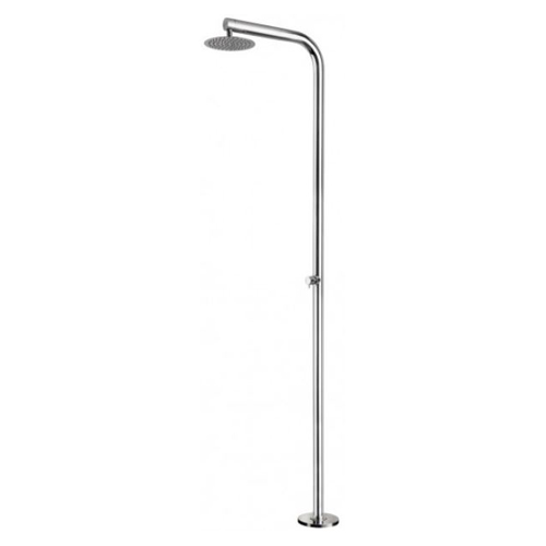 Colonna doccia per esterno in acciaio inox AISI 316L, serie GALAXY ONE. Dal design moderno, totalmente MADE IN ITALY. Composto da soffione doccia in acciaio inox Ø 200 mm, spessore 2 mm e miscelatore progressivo. Collegamento acqua a pavimento da 1/2”G. Predisposta per il funzionamento acqua calda/fredda.