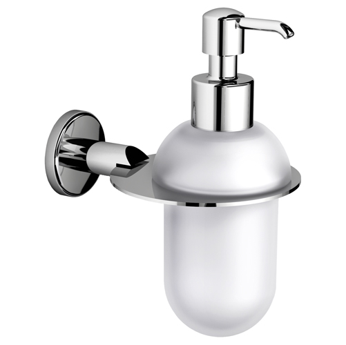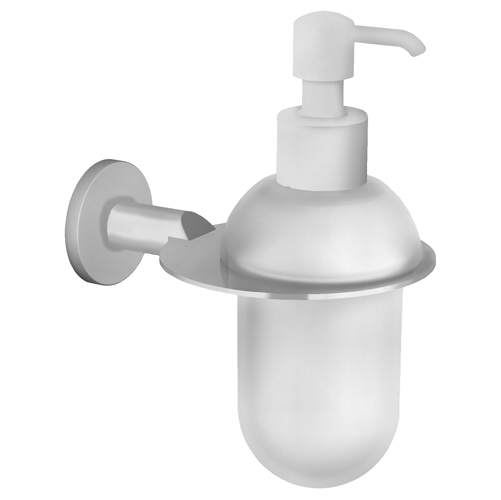 Dispenser da parete in acciaio inox AISI304 della serie PLAZA con contenitore in vetro satinato. Linea moderna di tendenza minimalista. E' dotata di un doppio sistema di fissaggio che assicura che gli accessori rimangano saldamente fissati al muro.