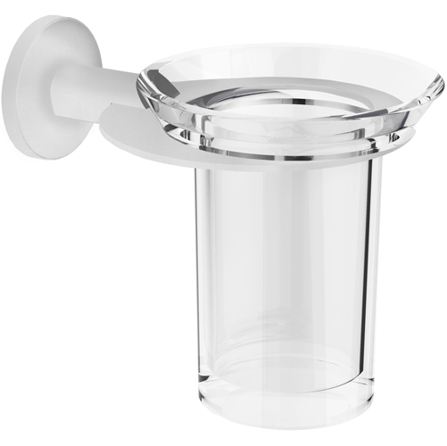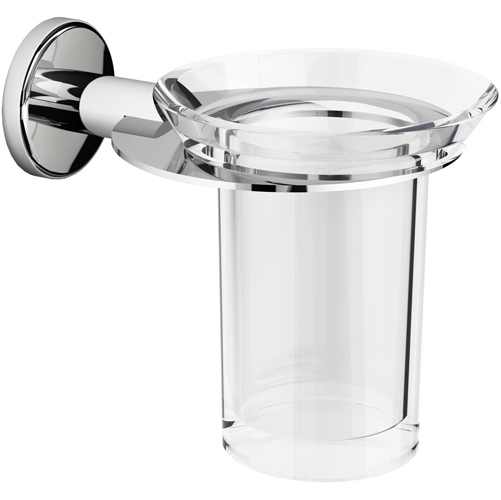 Porta bicchiere in acciaio inox AISI304 della serie PLAZA con contenitore in acrilico trasparente. Linea moderna di tendenza minimalista. E' dotata di un doppio sistema di fissaggio che assicura che gli accessori rimangano saldamente fissati al muro.