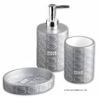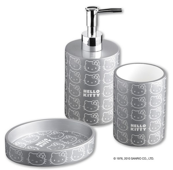 HELLO KITTY - SILVER collection dispenser per sapone d'appoggio in resina, di forma tonda con decori bianchi fatti a mano su elegante sfondo argento.