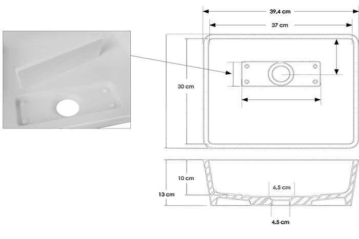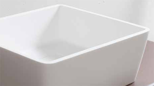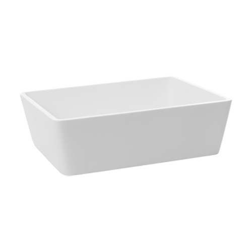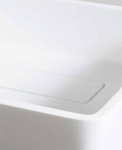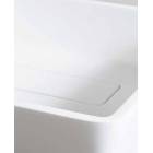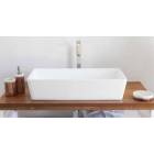Lavandino rettangolare da appoggio in betacryl della serie SLASH. Lavandino con bordi inclinati a basso spessore e scarico piletta nascosto. Realizzato in betacryl, color bianco ottico.