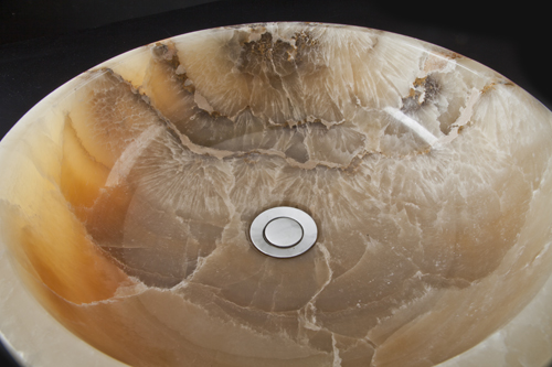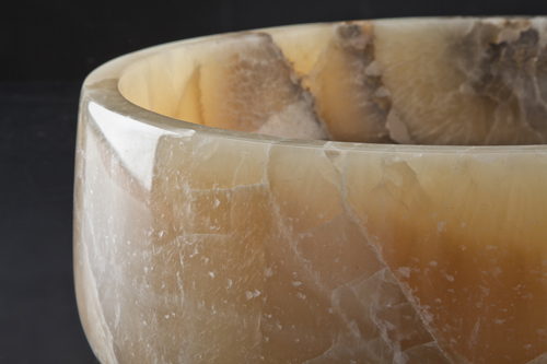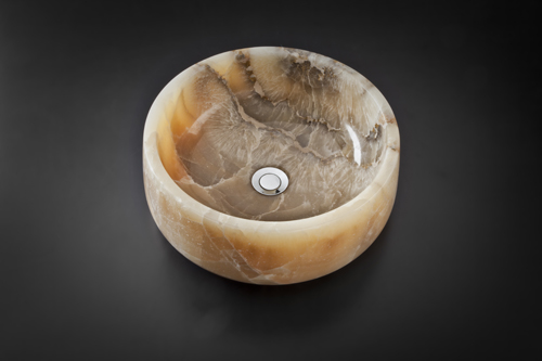 Lavandino da appoggio in pietra della serie KRATON. Pietra rara e preziosa l’Onice puro. Forma sensuale e sinuosa che trasforma il solo sfiorarlo in una esperienza sensoriale unica. Unico ed irripetibile, ogni pezzo è differente. Lavandino da appoggio in pura Onice levigata e lucidata. Quello fotografato è un esempio non ripetibile in serie.