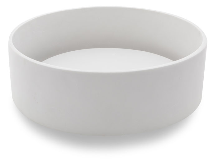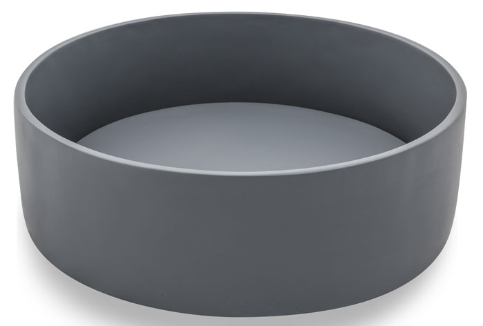 Lavandino da appoggio in resina della serie TRABOCCHETTO ROUND. Questo lavandino è dotato di una piatto removibile interno che, consentendo all’acqua di scolare dai bordi, copre e nasconde lo scarico centrale.