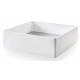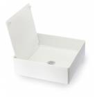 Lavandino da appoggio in resina bianca della serie TRABOCCHETTO. Questo lavandino è dotato di una piatto removibile interno che, consentendo all’acqua di scolare dai bordi, copre e nasconde lo scarico centrale.