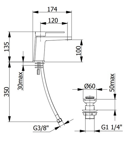 CARATTERISTICHE: MADE IN ITALY, miscelatore lavabo, corpo in ottone cromato, design moderno, attacchini M10x1 in acciaio inox 350 mm, attacco G 3/8" F, scarico click-clack da 1"1/4", set di fissaggio vite 2xM6, garanzia sul prodotto di 5 anni, imballo in scatola singola.