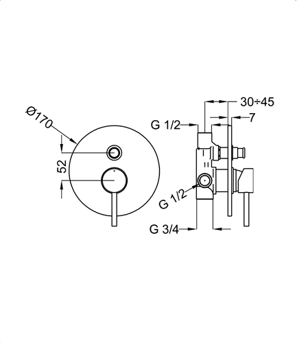CARATTERISTICHE: MADE IN ITALY, miscelatore doccia incasso, corpo in ottone cromato, design moderno, piastra Ø 170 mm, corpo incasso universale Ø 46 mm, deviatore Ø 21 mm, interasse 52 mm, garanzia sul prodotto di 5 anni, imballo in scatola singola.