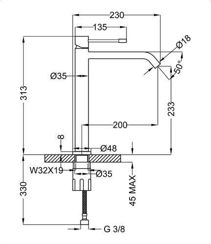 CARATTERISTICHE: MADE IN ITALY, miscelatore lavabo alto, corpo in ottone cromato, design moderno, attacchini M10x1 in acciaio inox 500 mm, attacco G 3/8", scarico clic-clac da 1 1/4", completo di cartuccia aperta e aeratore NEOPERL con rete rimozione calcare, garanzia sul prodotto di 5 anni, imballo in scatola singola.