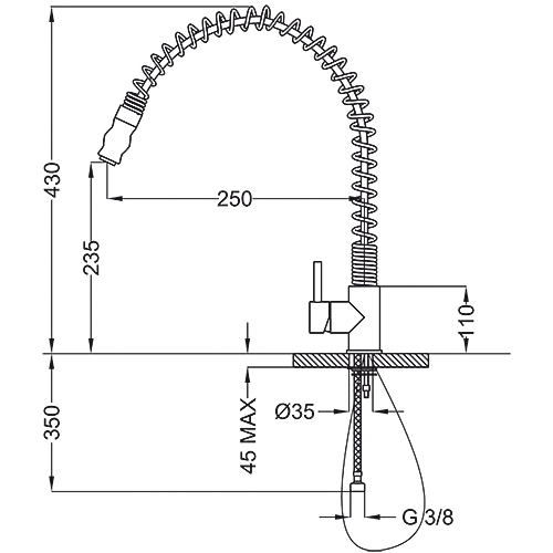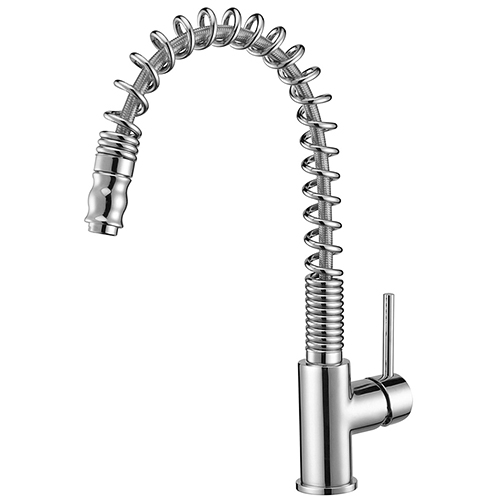 CARATTERISTICHE: MADE IN ITALY, miscelatore lavello, monocomando, corpo in ottone cromato, design moderno, doccia a molla orientabile, flessibile doccia, leva laterale, aeratore M24x1, cartuccia Ø 35 mm senza distributore, attacchini M10x1 in acciaio inox 500 mm, connessione G3/8” F, garanzia sul prodotto 5 anni, imballo in scatola singola.