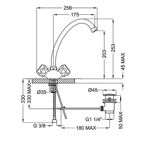 CARATTERISTICHE: MADE IN ITALY, monoforo lavello, corpo in ottone cromato, design tradizionale, maniglie laterali, vitone G1/2" broccia 8x20, aeratore M22x1, canna orientabile, attacchini M10x1 in acciaio inox 370 mm, attacco G 3/8" F, set di fissaggio 1xM8, garanzia sul prodotto 5 anni, imballo in scatola singola.