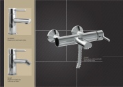 5145E(KK) Single lever wash basin mixer. 5146E Single lever bidet set with pop-up drain. 5140EE Single lever wall mount bath and shower mixer.